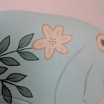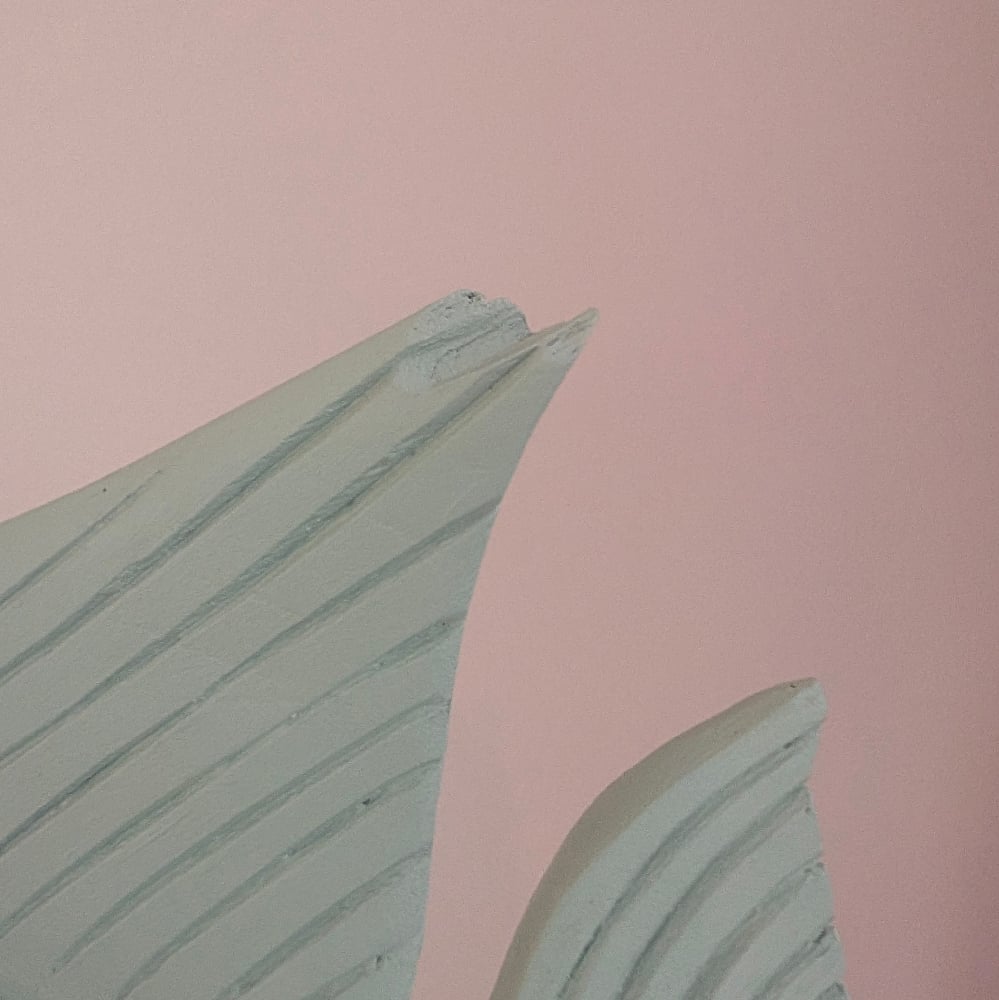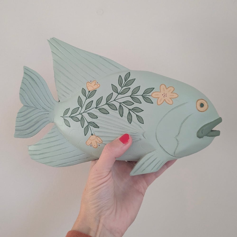A wooden fish that has been upcycled with a hand painted folk art floral pattern. The base has a mint green tone to it, cool green leaves, and pale yellow/beige flowers. Has some damage to the tips of two fins but still cute.
