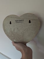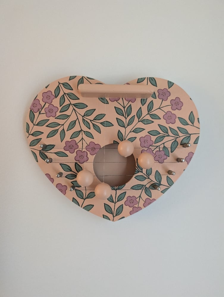 Heart shaped wooden door harp hand painted a pastel peach with wrap around green vines and lots of little pink flowers. Hang on the inside of your front door to play a fun tune when you or your guests enter your home, place it on your favorite kitchen cupboard door, or do what I've been doing and hang it on a wall and pull up the strikers each time you walk by.