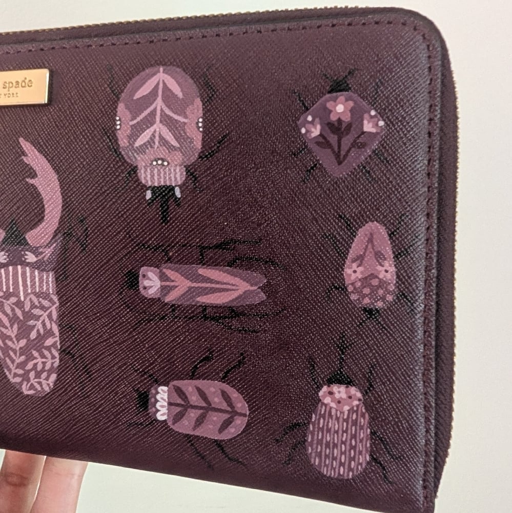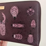 Large leather wallet hand painted with little folky floral beetles. Monochromatic color scheme with varying shades of plum/purple.