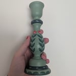 Two wooden candlesticks hand painted with a folk art floral style. Muted cool green base with bright pink/red flowers.